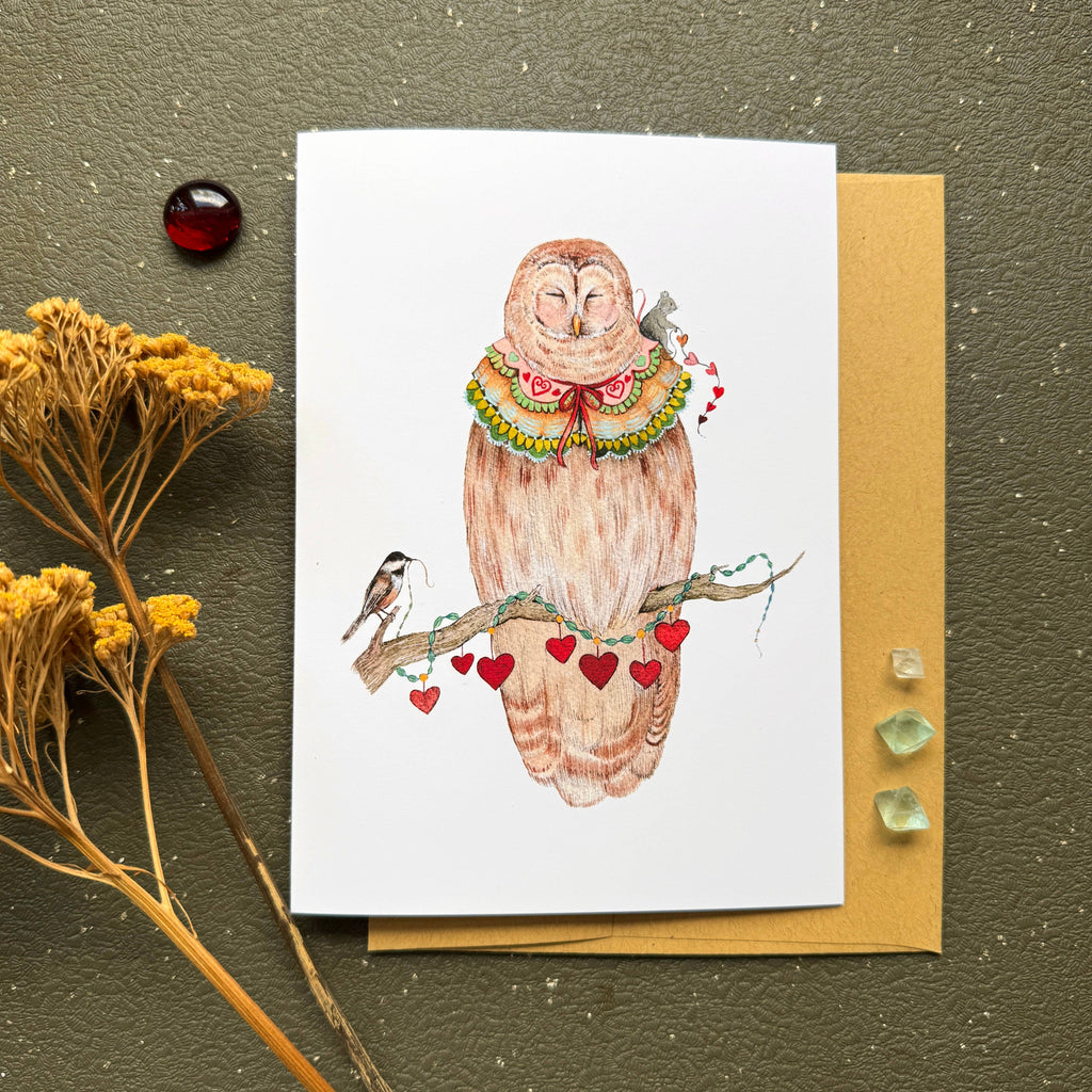 Love is a Hoot Card The card is 5"x7" and comes with a matching envelope. Blank inside so that it can be used throughout the year. Each card is carefully packed in a clear archival sleeve.