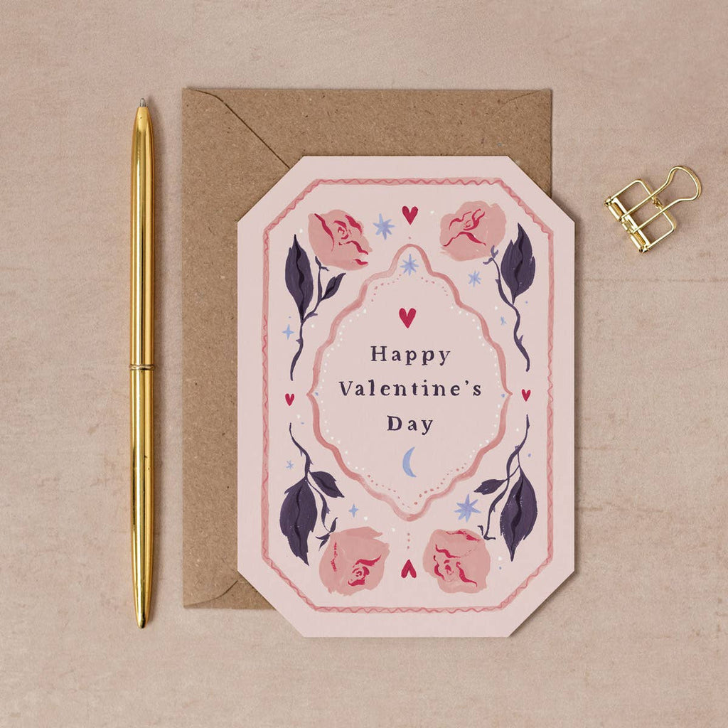Gorgeous hand-painted roses adorn the front of this gem-shaped Valentine’s Card, surrounding a hand-lettered caption reading “Happy Valentine's Day”.