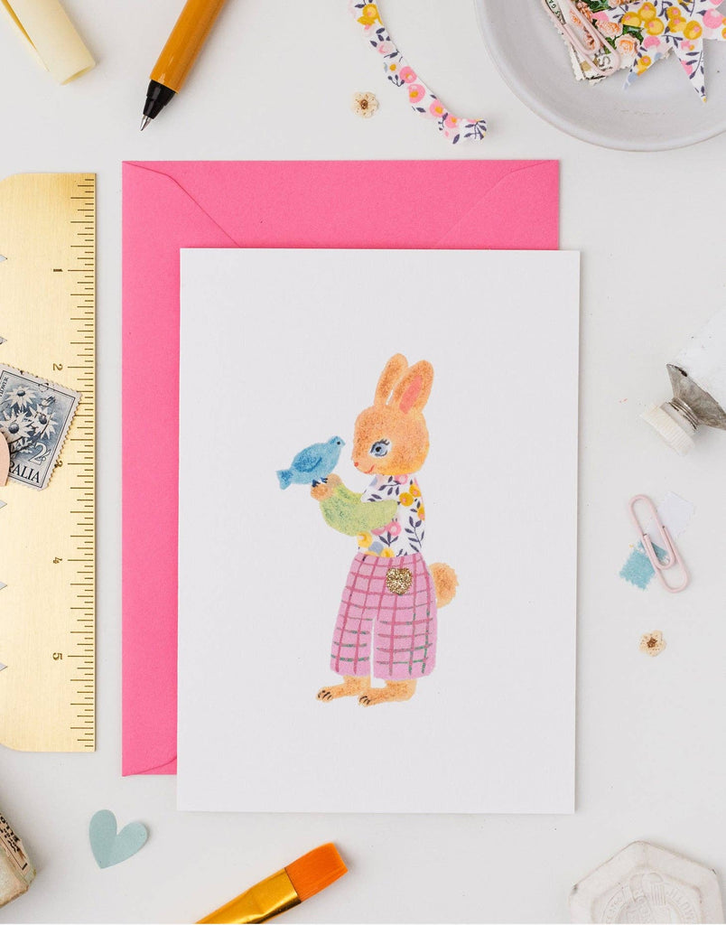 A delightful little rabbit with a feathered friend wearing a waistcoat in the Wiltshire Bud print. Hand finished with a golden biodegradable glitter pocket on one of her trousers.
