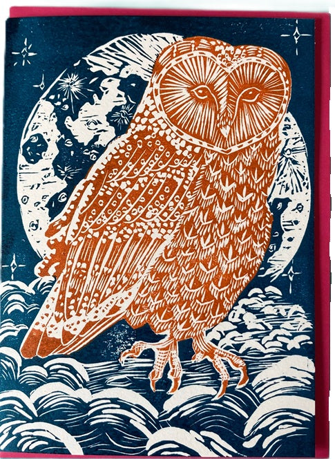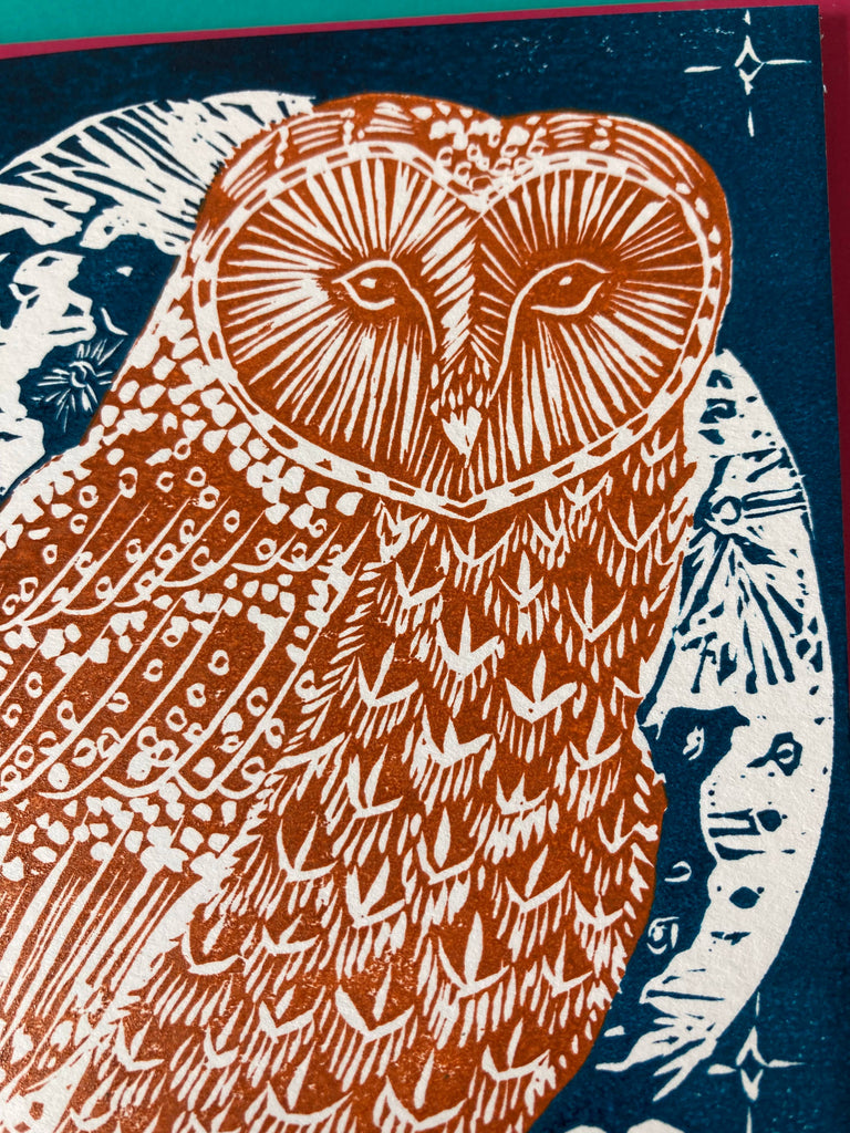 This original hand designed and block printed card is of an owl backlit by a large full moon.