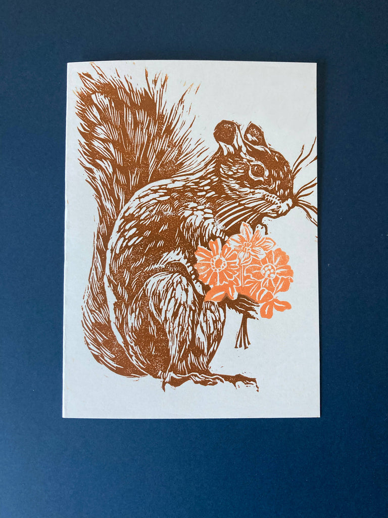 {Persephone Print} Block Printed Card :: Squirrel with Present