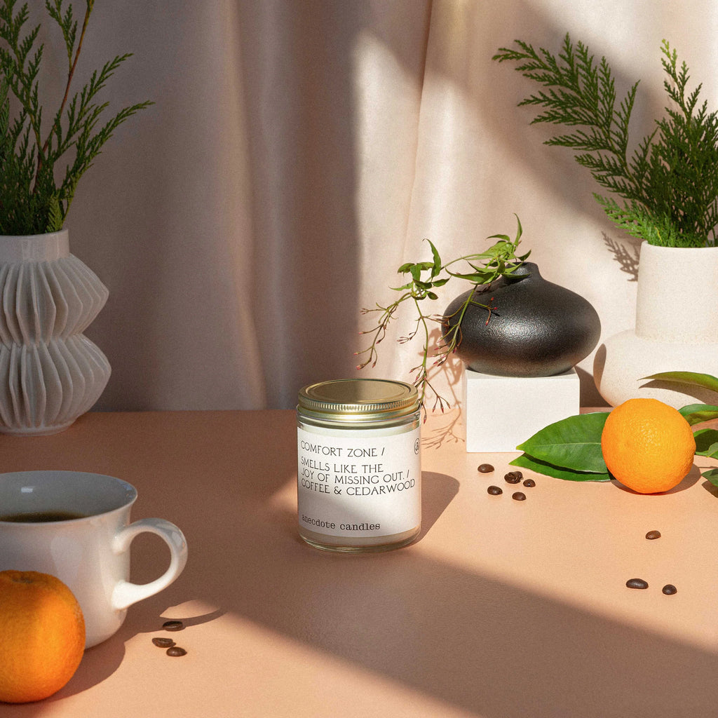 Coffee & Cedarwood - Warm and seductive, Comfort Zone is the candle to burn when you want to escape from it all. Orange blossom floats above a rich heart of coffee and jasmine, grounded by the warmth of vanilla, patchouli, and cedarwood for a modern take on introversion.