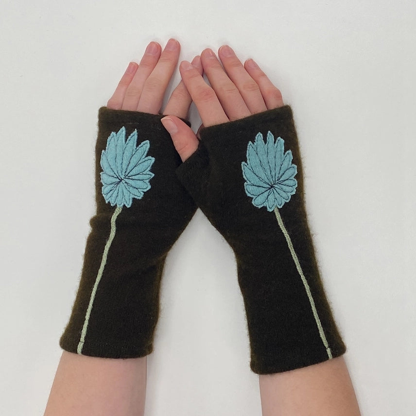 {Sardine Clothing Co.} Fingerless Cashmere Gloves :: Double Blooming Rose :: Light Blue on Green