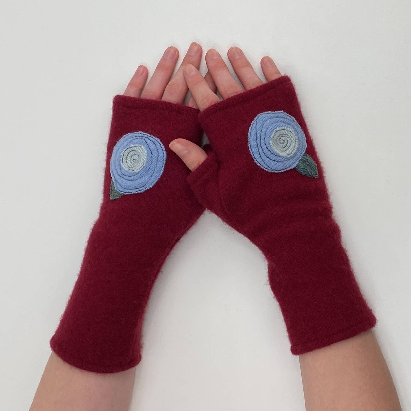 These are beautifully warm cashmere fingerless gloves. All gloves are individually made from super soft, lightly felted recycled cashmere and freestyle appliquéd so each pair is one of a kind. The open fingertop gives you the freedom to drive, text, knit, read, or drink coffee. Simply tuck your fingers inside if chilly!