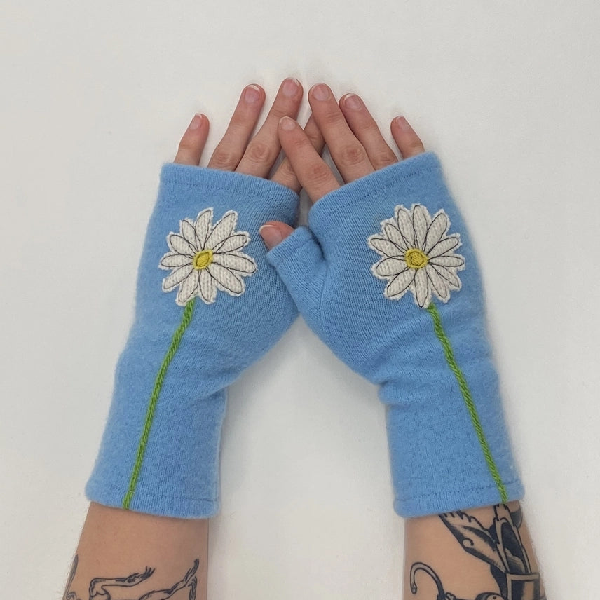 {Sardine Clothing Co.} Fingerless Cashmere Gloves :: Daisy :: White on Blue