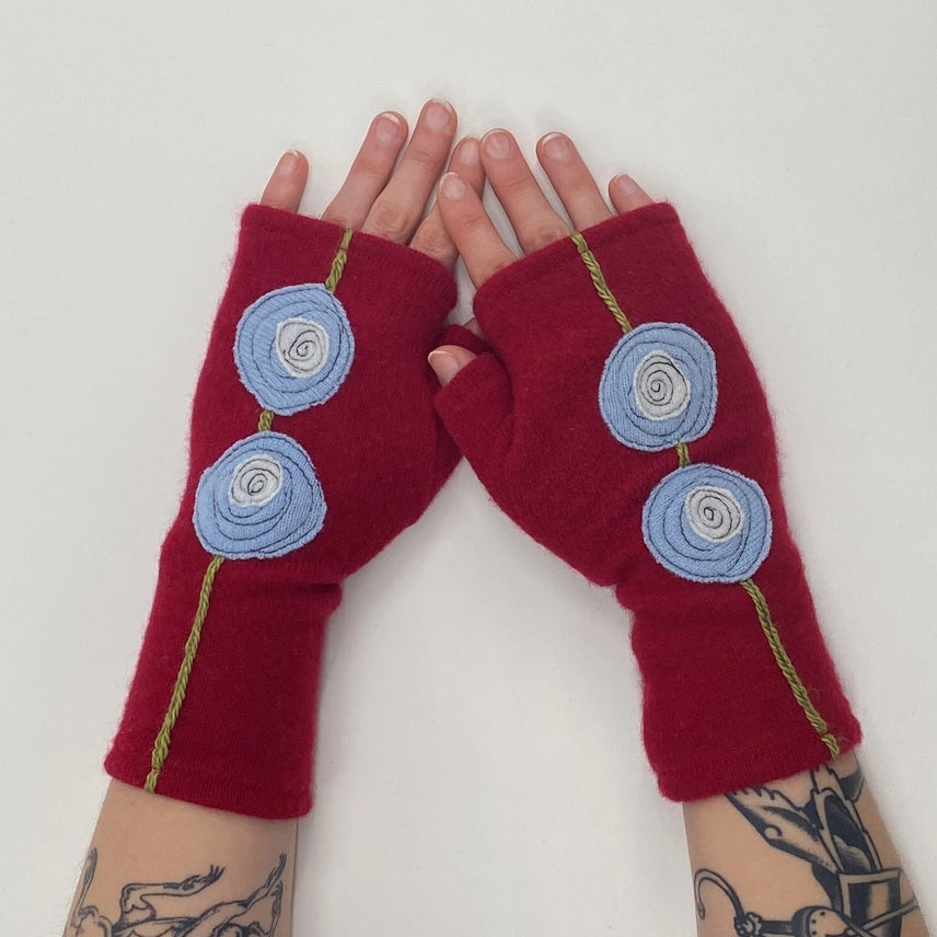 {Sardine Clothing Co.} Fingerless Cashmere Gloves :: Double Blooming Rose :: Light Blue on Red is backordered. It will be shipped when back in stock.