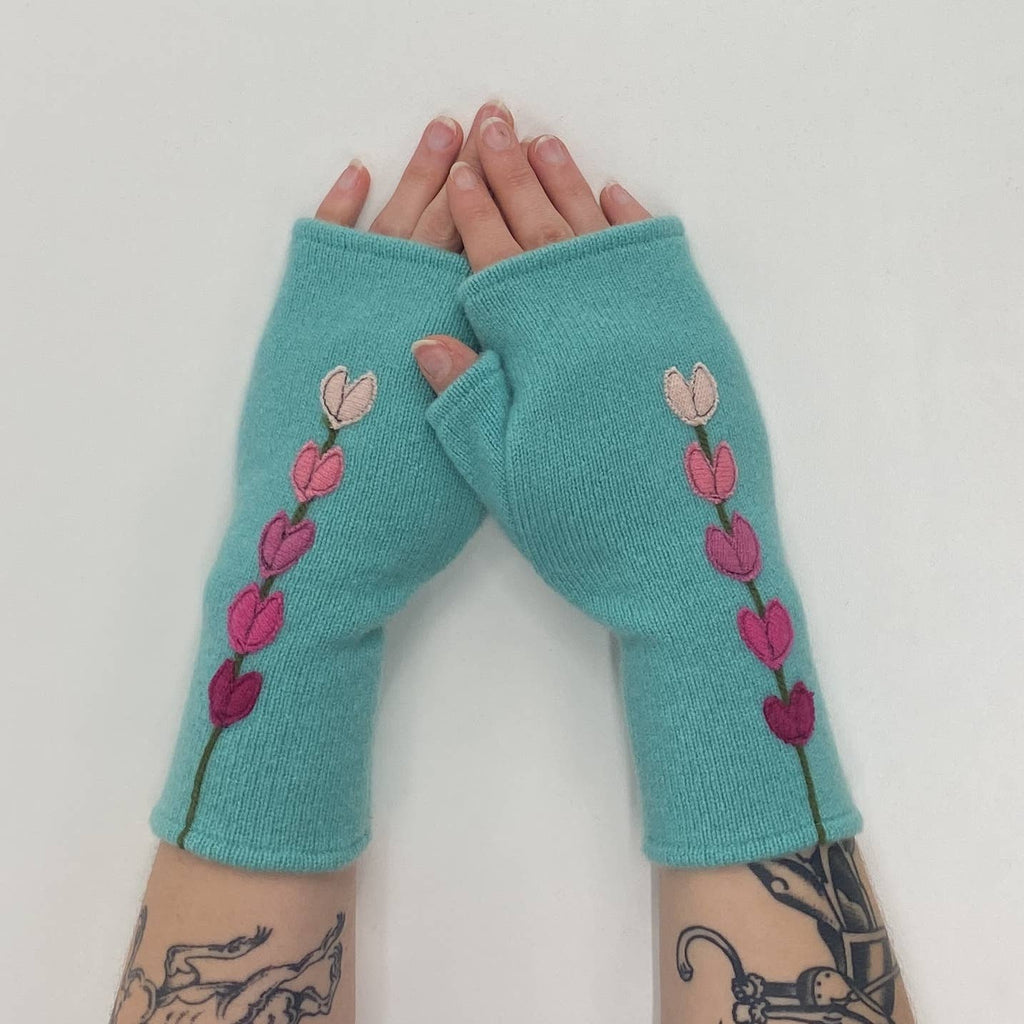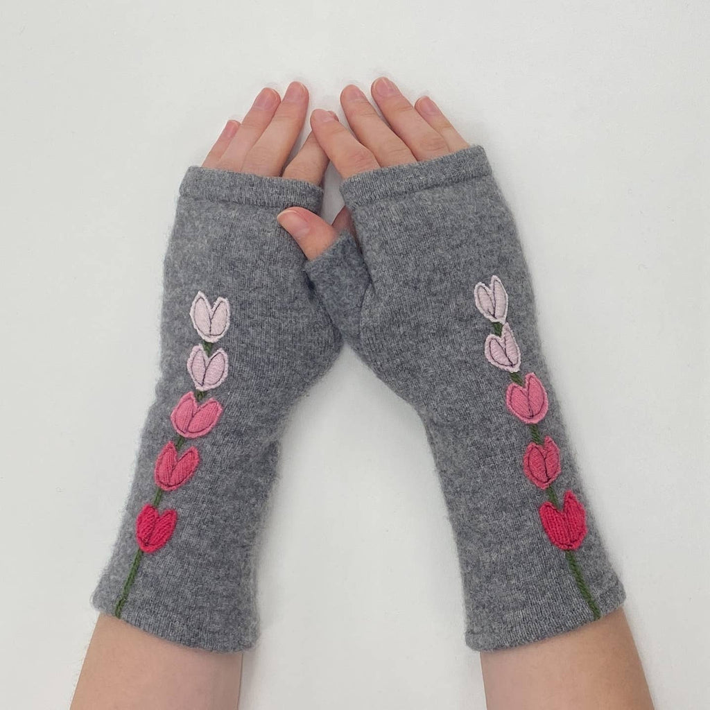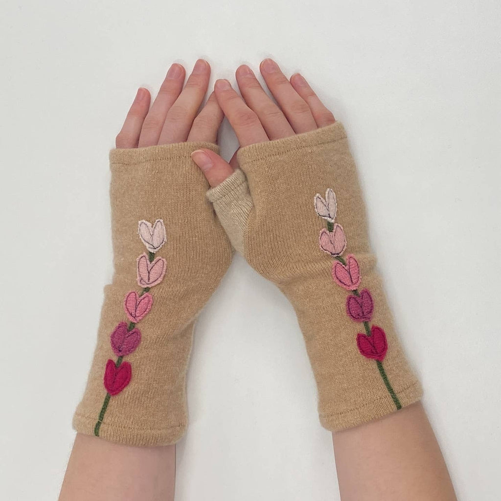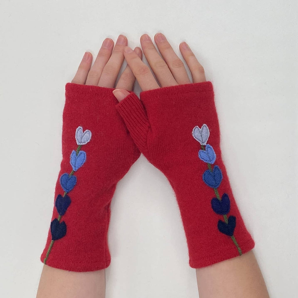 These are beautifully warm cashmere fingerless gloves. All gloves are individually made from super soft, lightly felted recycled cashmere and freestyle appliquéd so each pair is one of a kind. The open fingertop gives you the freedom to drive, text, knit, read, or drink coffee. Simply tuck your fingers inside if chilly!