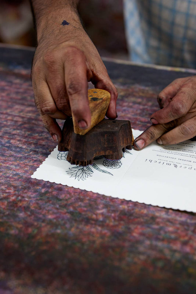 This block printed greeting card is a real delight for any stationery lover. Each card is hand block printed by a skilled artisan on luxurious tree-free 250gsm cotton cardstock and is accompanied by a luxury peel and seal envelope which is hand block printed in the matching on the reverse for understated appeal.