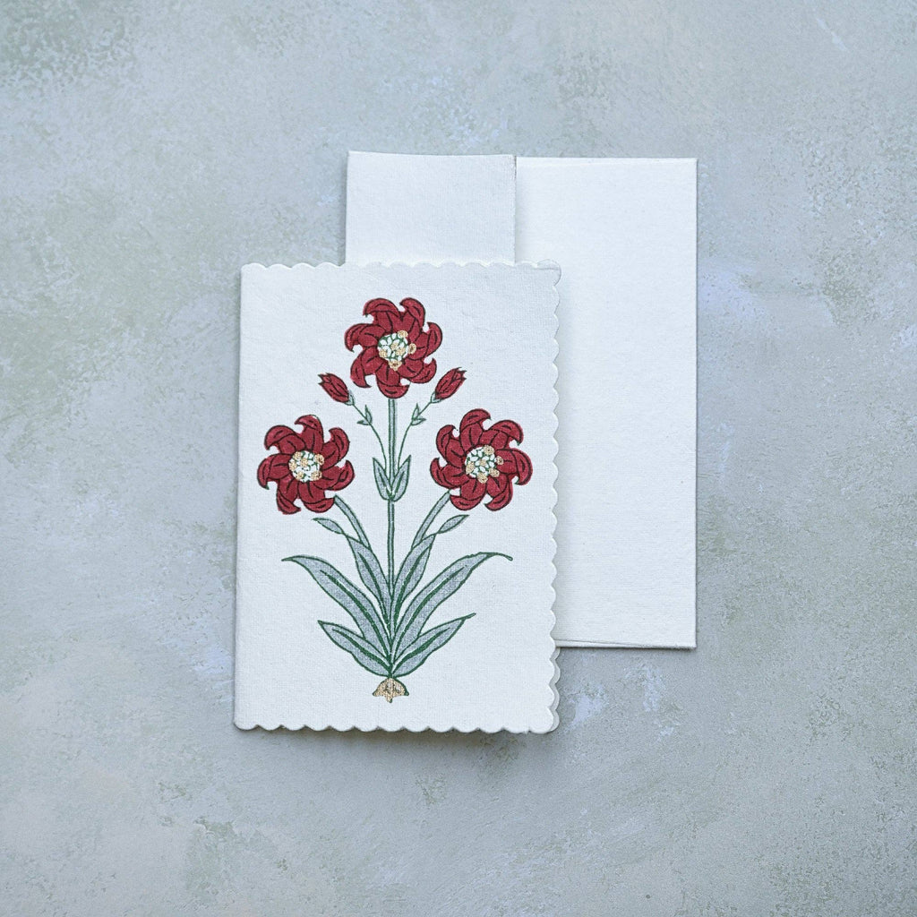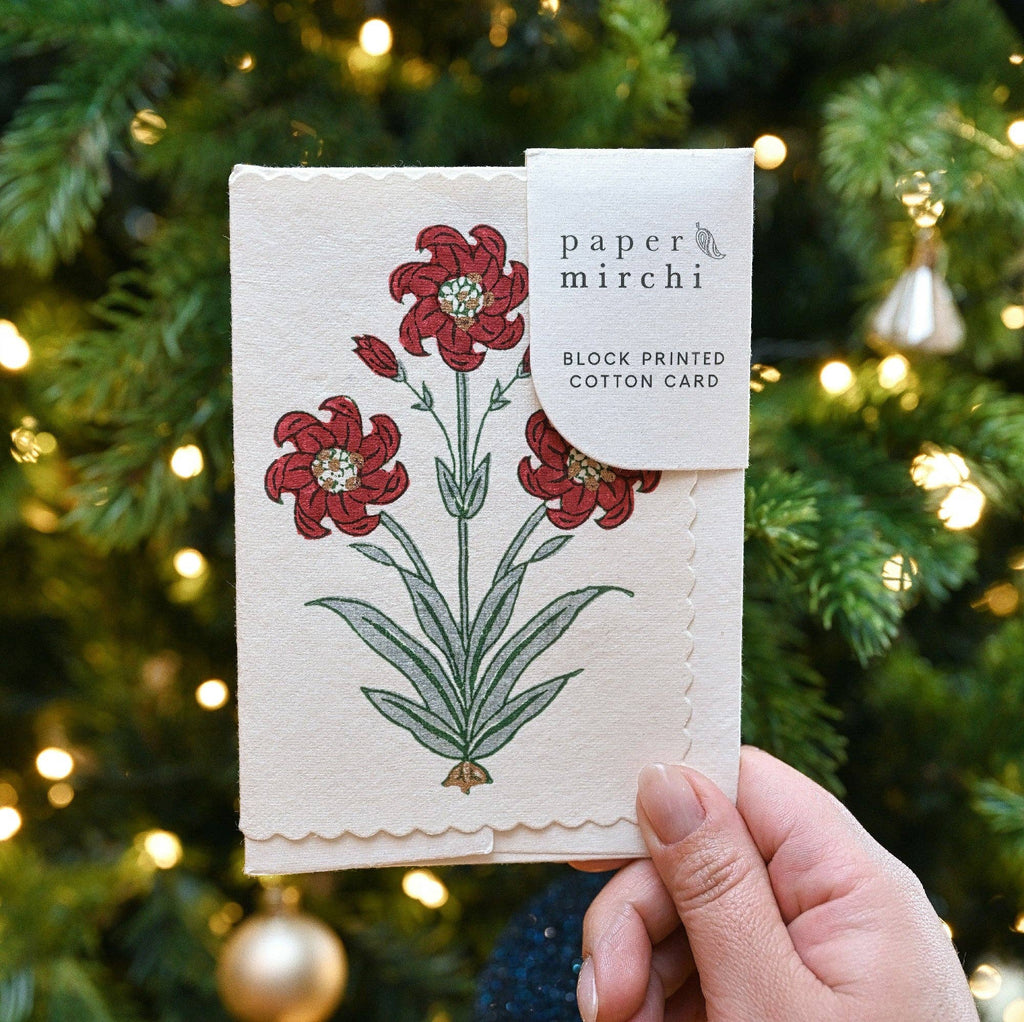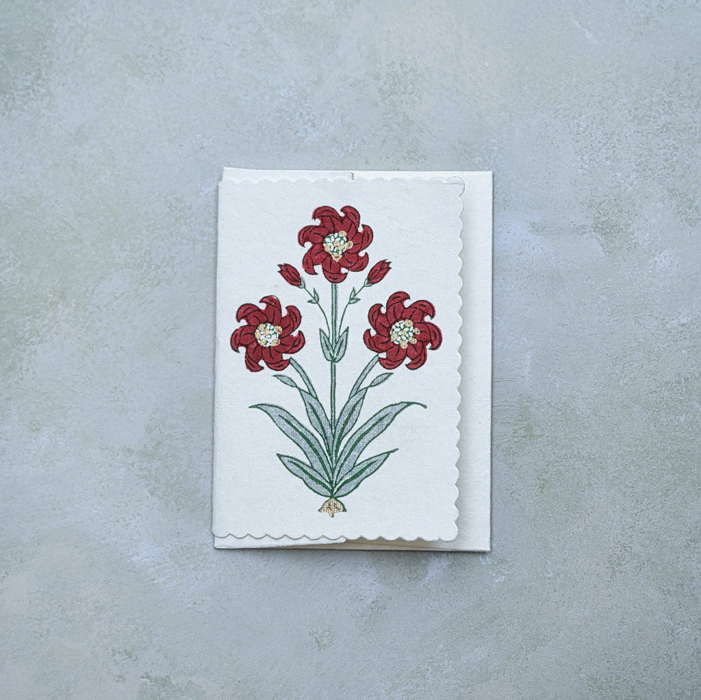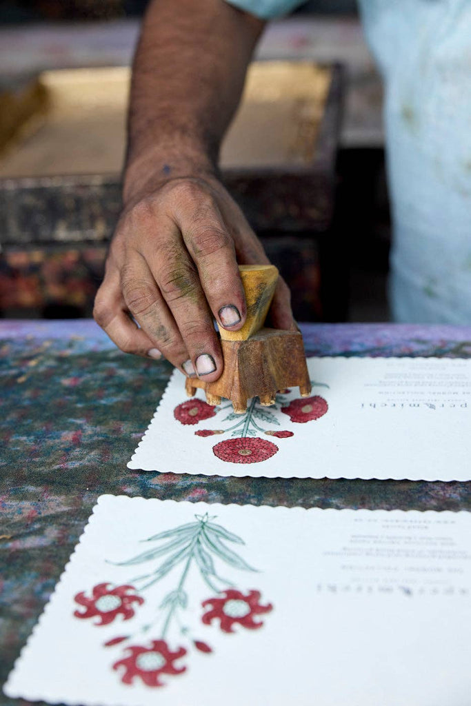 This block printed greeting card is a real delight for any stationery lover. Each card is hand block printed by a skilled artisan on luxurious tree-free 250gsm cotton cardstock and is accompanied by a luxury peel and seal envelope which is hand block printed in the matching on the reverse for understated appeal.