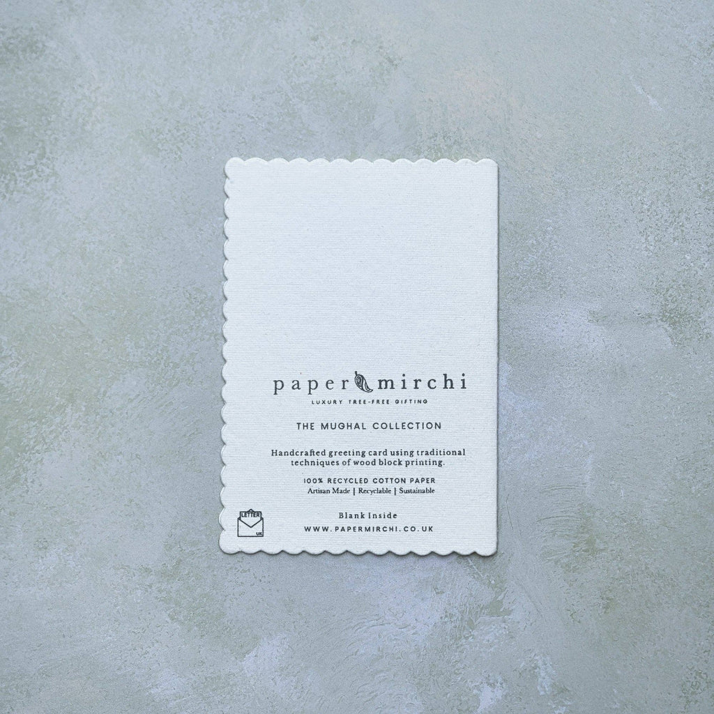 This block printed greeting card is a real delight for any stationery lover. Each card is hand block printed by a skilled artisan on luxurious tree-free 250gsm cotton cardstock and is accompanied by a luxury peel and seal envelope which is hand block printed in the matching on the reverse for understated appeal.