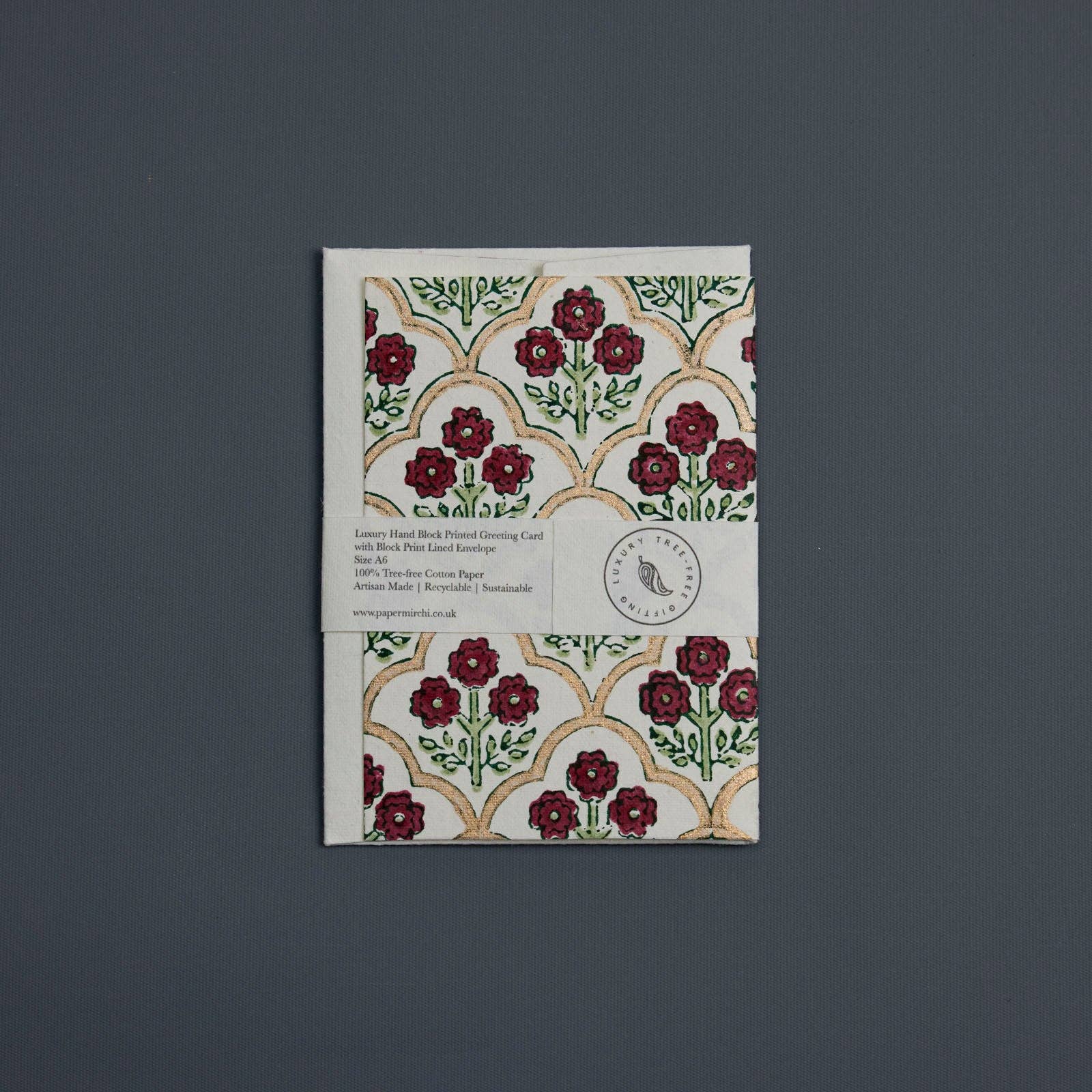 This block printed greeting card is a real delight for any stationery lover. Each card is hand block printed by a skilled artisan on luxurious tree-free 250gsm cotton cardstock and is accompanied by a luxury peel and seal envelope which is hand block printed in the matching on the reverse for understated appeal.
