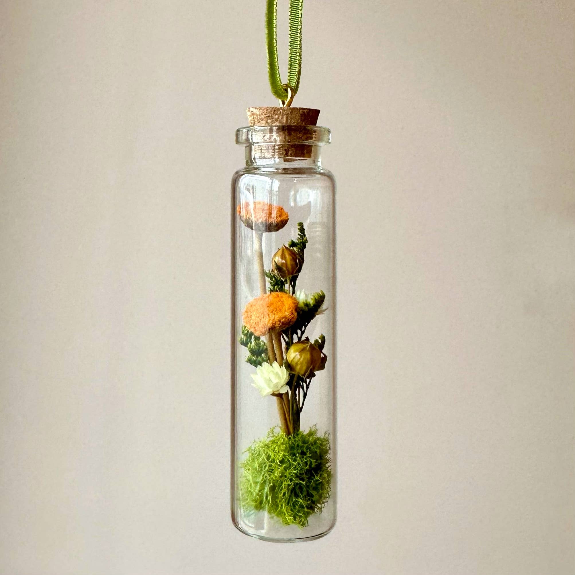 Glass terrarium Christmas ornament made with real dried florals and mosses!