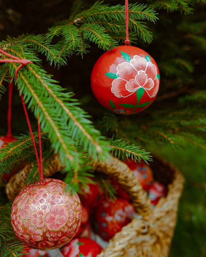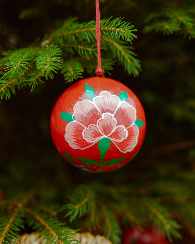 This beautiful bauble is made from papier mâché recycled paper, hand-painted with intricate, colourful designs, and have a soft cotton thread hanging loop.