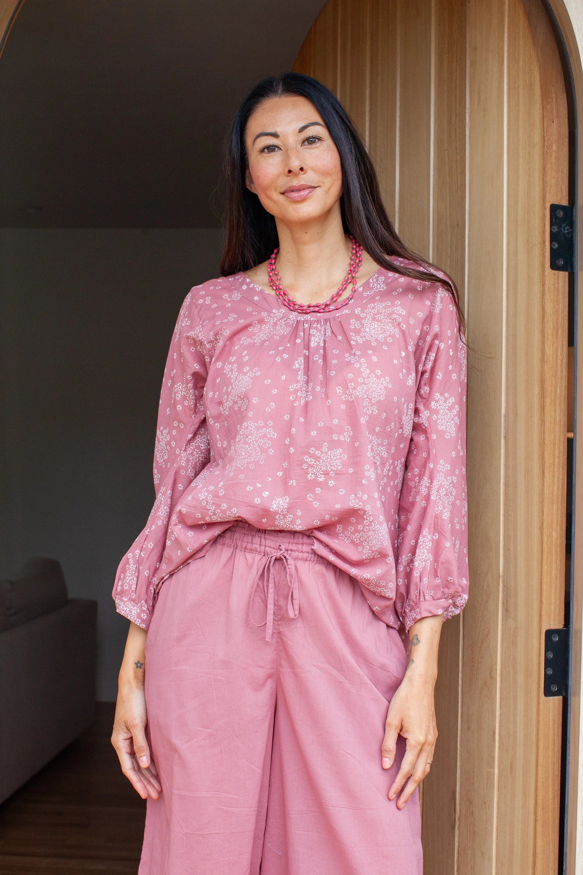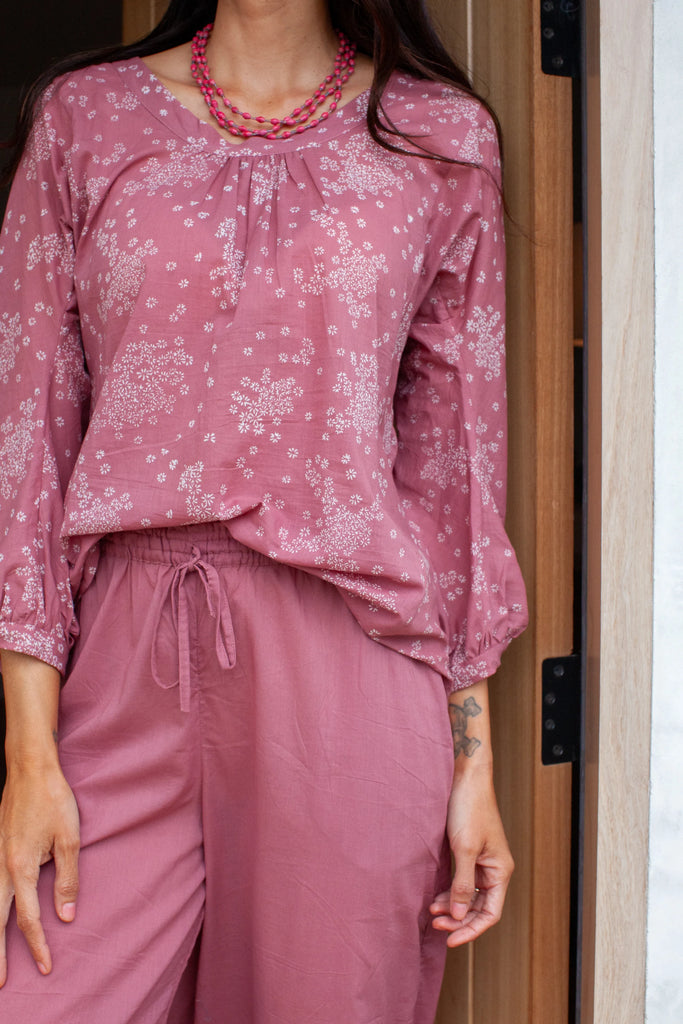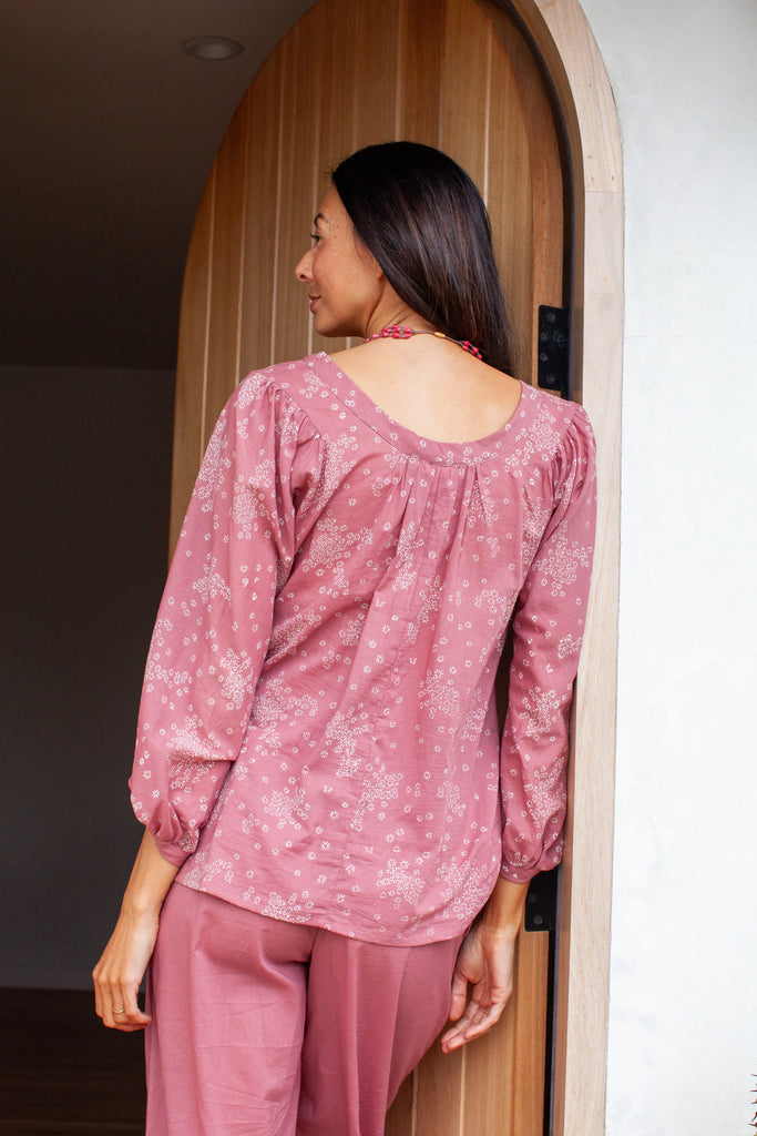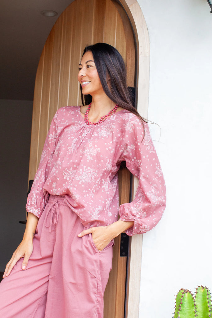 {Kerry Cassill} Hand Block Printed Cotton 3/4 Sleeve Blouse :: Cranberry Star - Size P/S is backordered. It will be shipped when back in stock.