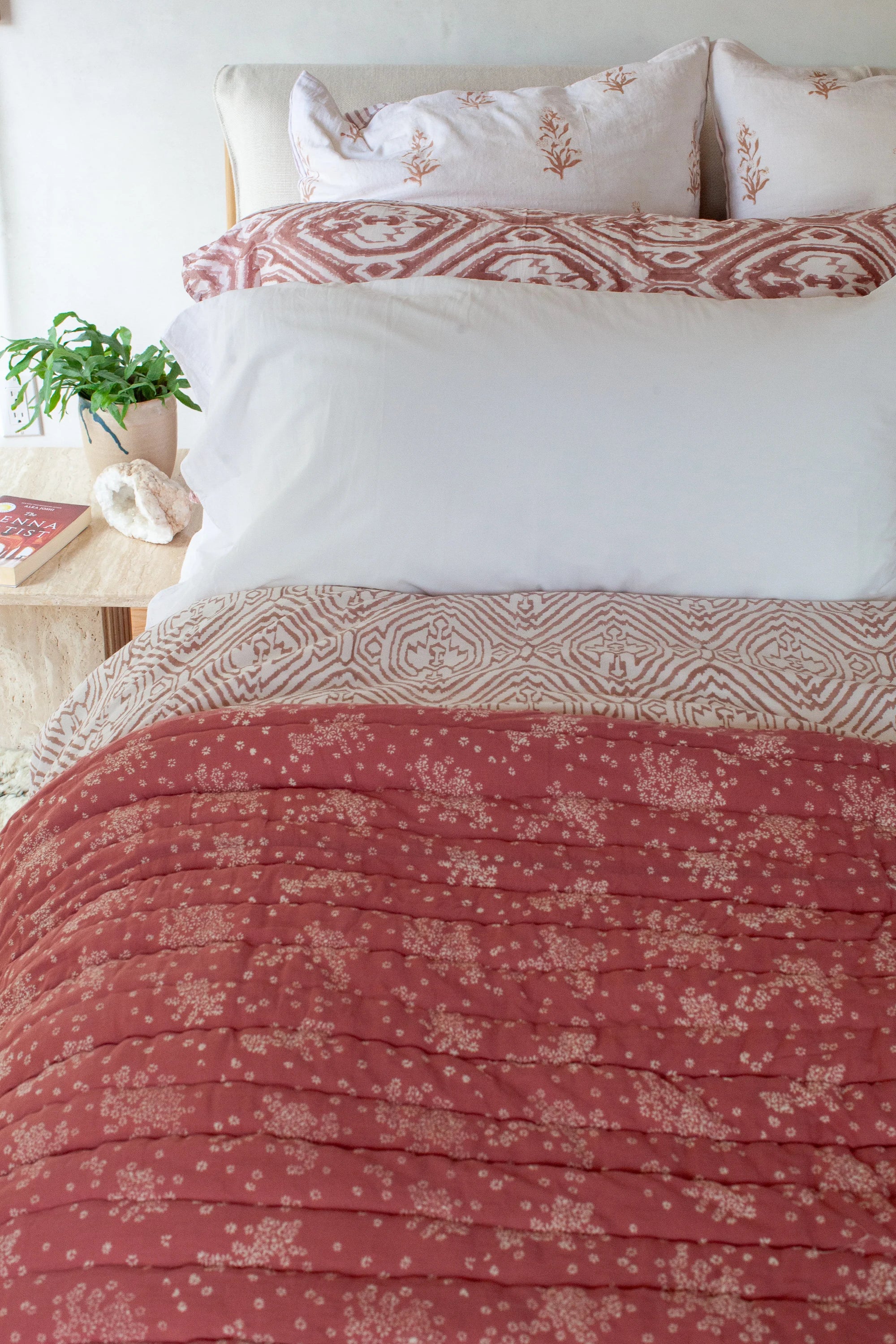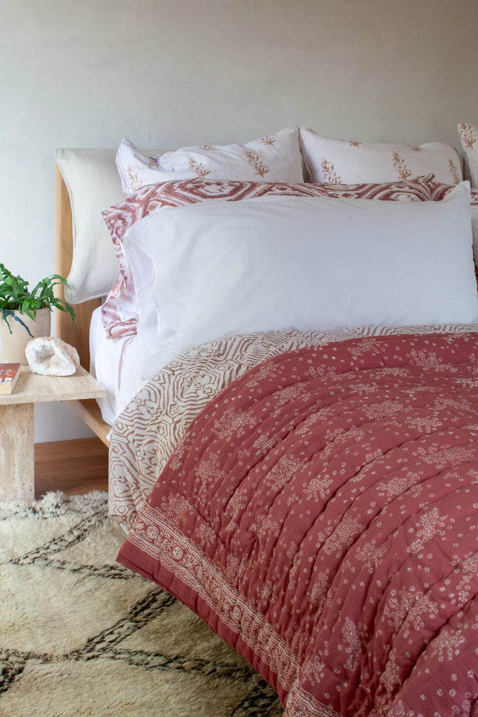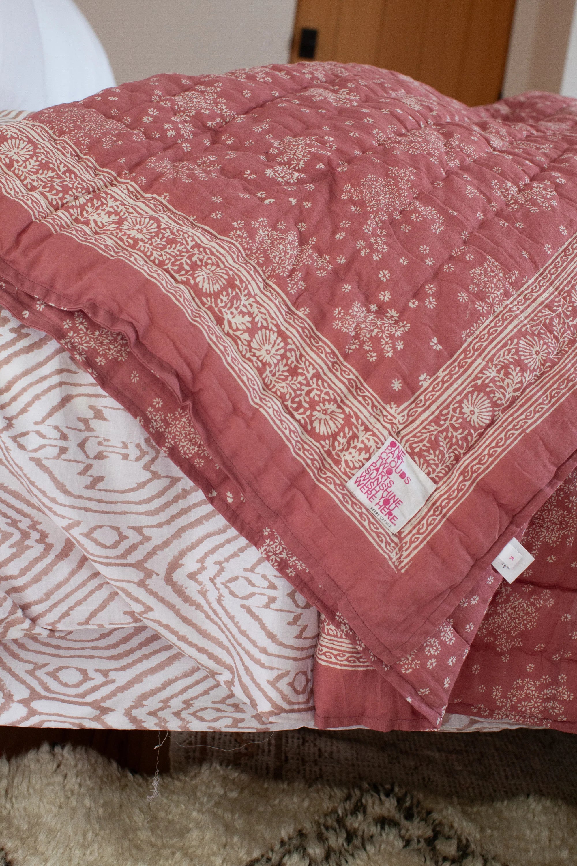 This beautiful quilt is hand block printed and includes cotton batting complimented with a simple hem.