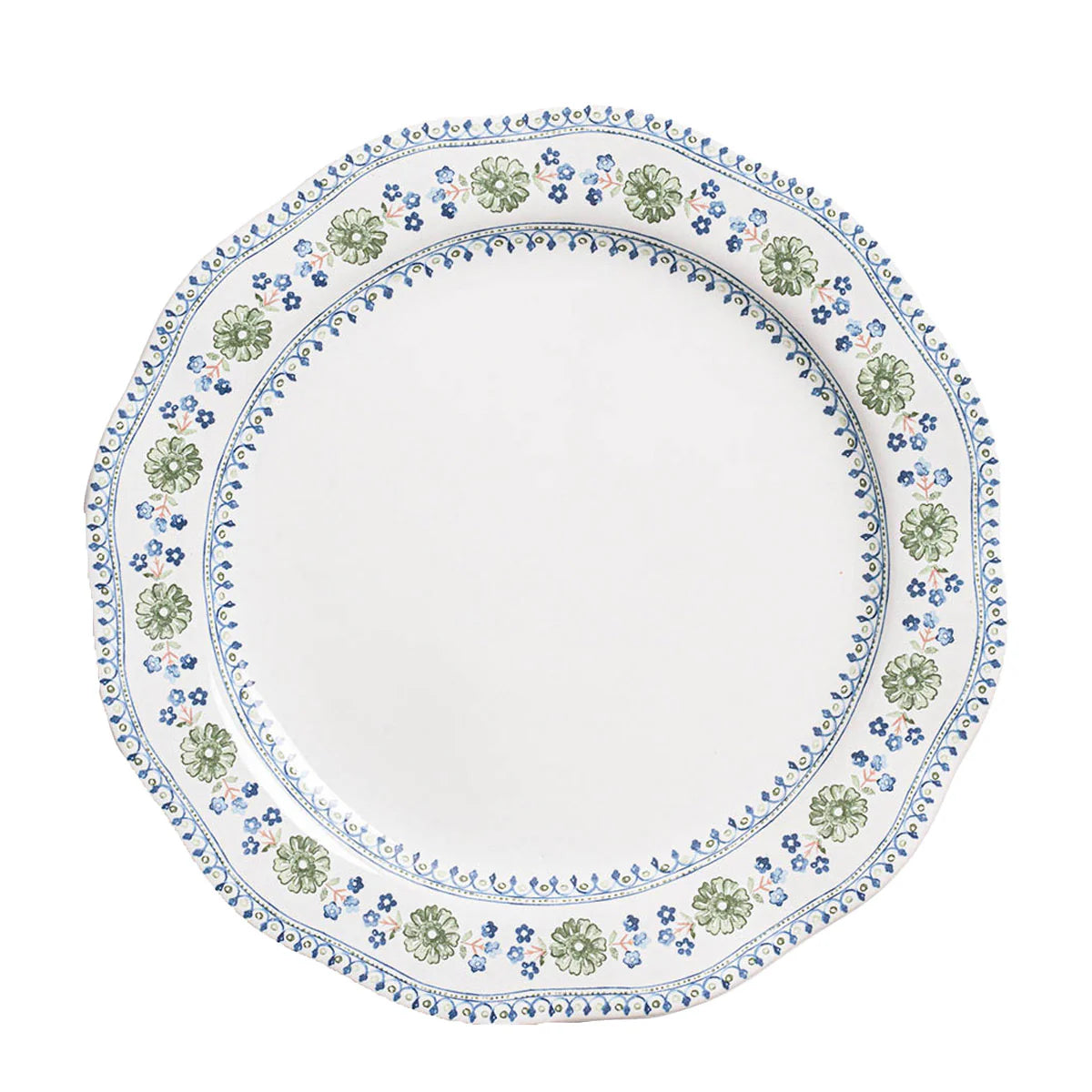 With our heads in the clouds and our feet on the cobblestone streets of ancient Seville, we dreamt up this intricate floral motif that reimagines the romantic city's hand-painted tiles and patterns, rendered in the organic colors of the Spanish countryside. Equal parts fresh, tranquil, and whimsical, the scalloped rim of this dinner plate is perfect for framing culinary creations and adding a lovely layer to place settings for mixing and matching.