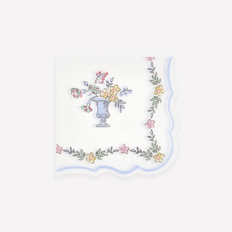 Add elegance and charm to any table with these stylish small paper napkins. Inspired by rococo dinnerware, they feature a chintz-style floral design with a decorative urn at the center. The softly waved edge offers a graceful finish, echoing the beauty of vintage ceramics with a fresh touch. Perfect for garden lunches, afternoon teas or springtime dinners, they bring a sense of occasion to grown-up gatherings.