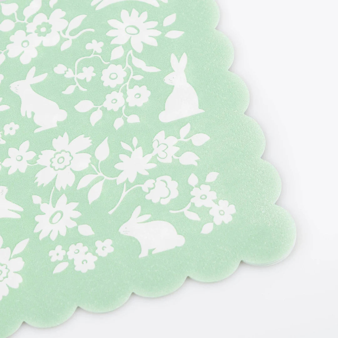 Set the table for springtime joy. These Ditsy Bunny Small Napkins are a fresh, charming way to elevate your seasonal table. Featuring a ditsy floral pattern, adorable bunny illustrations, and a softly scalloped edge, they're full of playful character with a polished finish. Each set comes in four beautiful spring shades, perfect for mixing and matching with the rest of your Easter tableware. Ideal for kids and adults alike.