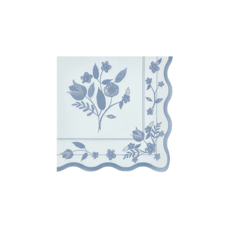 Add a sophisticated touch to your table with this set of small pastel paper napkins. Soft shades of pink, blue, green and yellow provide a fresh backdrop for cobalt blue botanical illustrations, inspired by vintage dinnerware. The design brings timeless style, while a wavy edge in a matching blue shade gives a refined detail. Ideal for spring soirées, bridal showers, chic picnics, baby showers or any grown-up gathering.