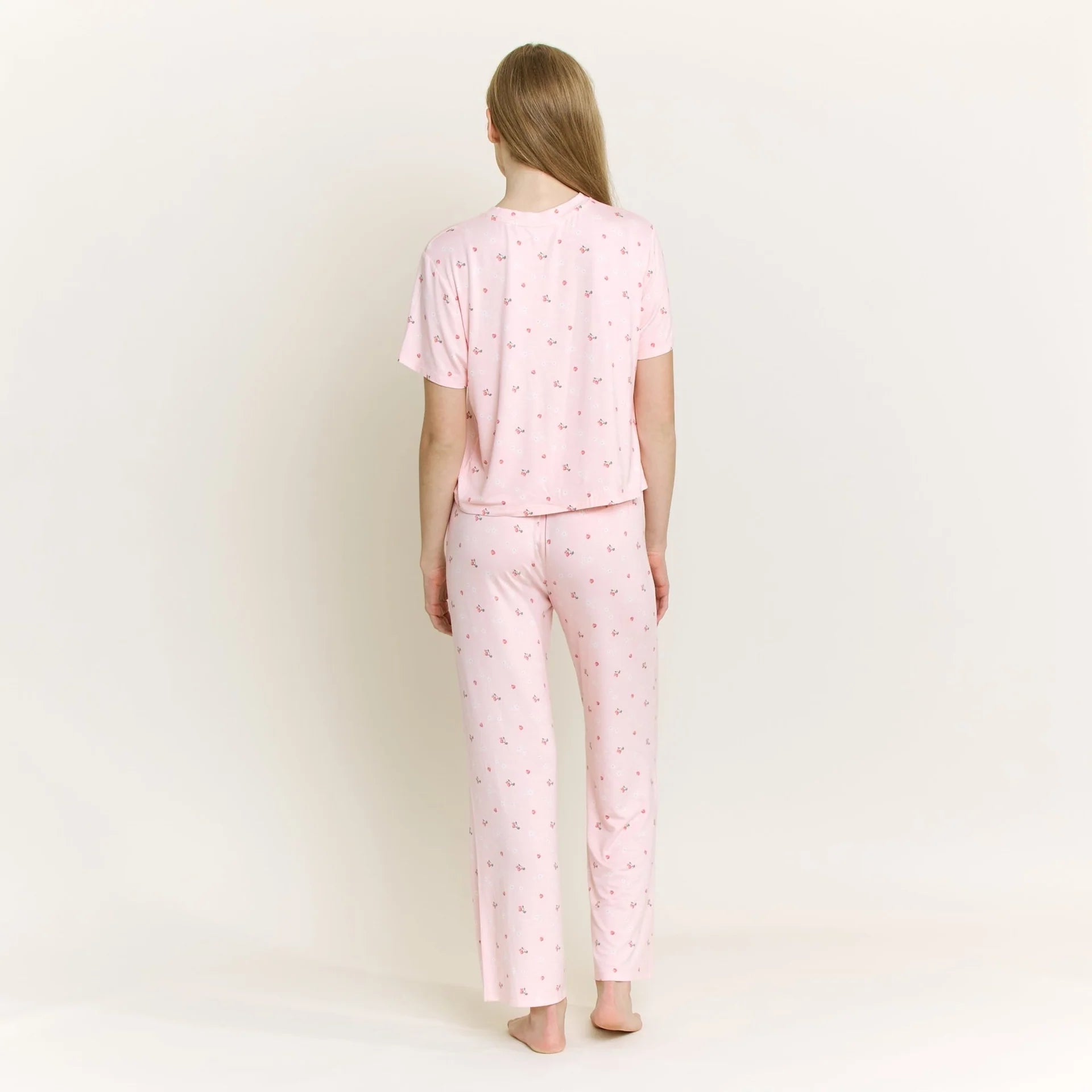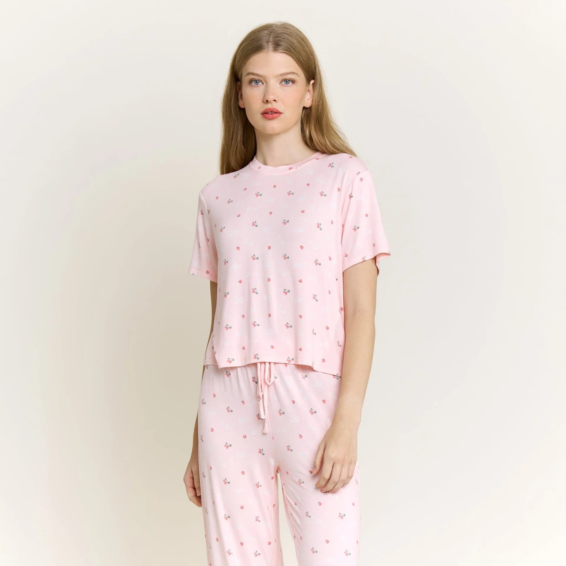 A relaxed short sleeve drop-shoulder tee paired with a wide leg drawstring pant in a soft, lightweight jersey fabric.