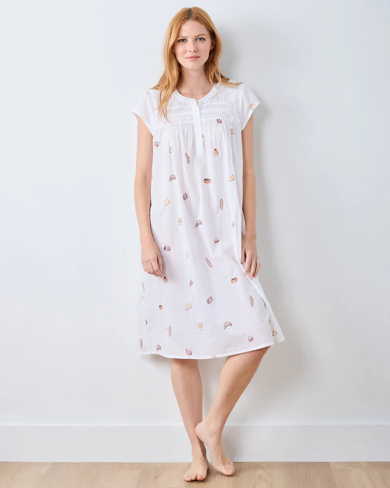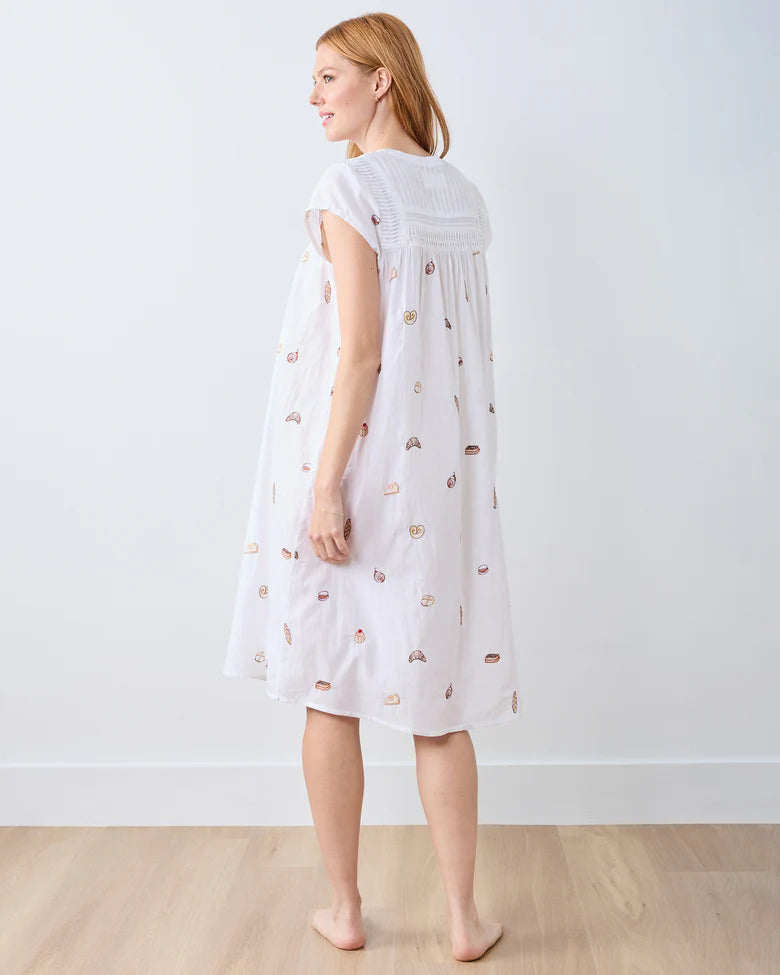 Sweeten your bedtime routine with this embroidered cotton nightgown featuring croissants, baguettes, and delightful pastries. The Freshly Baked nightgown is crafted from crisp organic cotton cambric with vintage-inspired pintuck detailing and sweet cap sleeves. This soft cotton sleepwear offers a flowing knee-length silhouette. A delicious baking nightgown for weekend mornings.