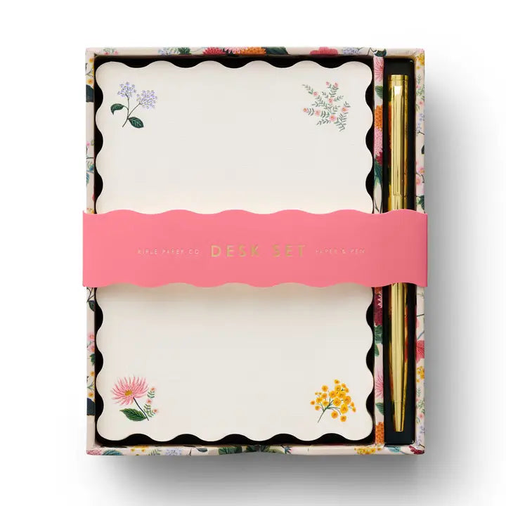 Practice the art of letter writing with a letter writing set. Includes 130 linen texture flat note sheets and 1 gold pen with black ink. Packaged in a reusable desk organizer box.
