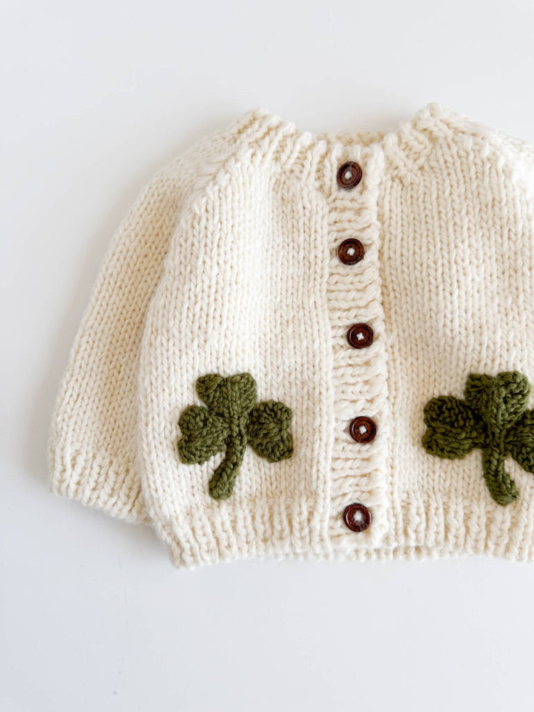 This cream-colored cardigan features four-leaf green clover details. Create the cutest St. Patty's outfit and style your little one.
