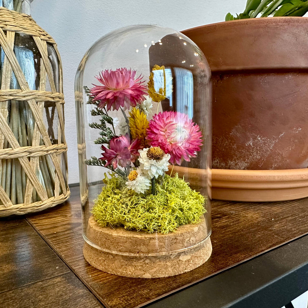 Sunblush Terrarium Glass terrarium made with real dried florals and mosses! This is the perfect desk trinket or decoration for your nightstand or windowsill.