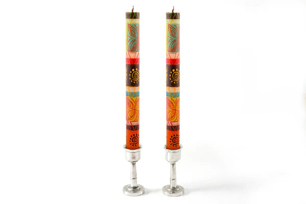 These fair trade, hand poured and hand painted candles from South Africa. They are made with the highest quality natural paraffin wax with cotton wicks. They are unscented, smokeless and drip-free.