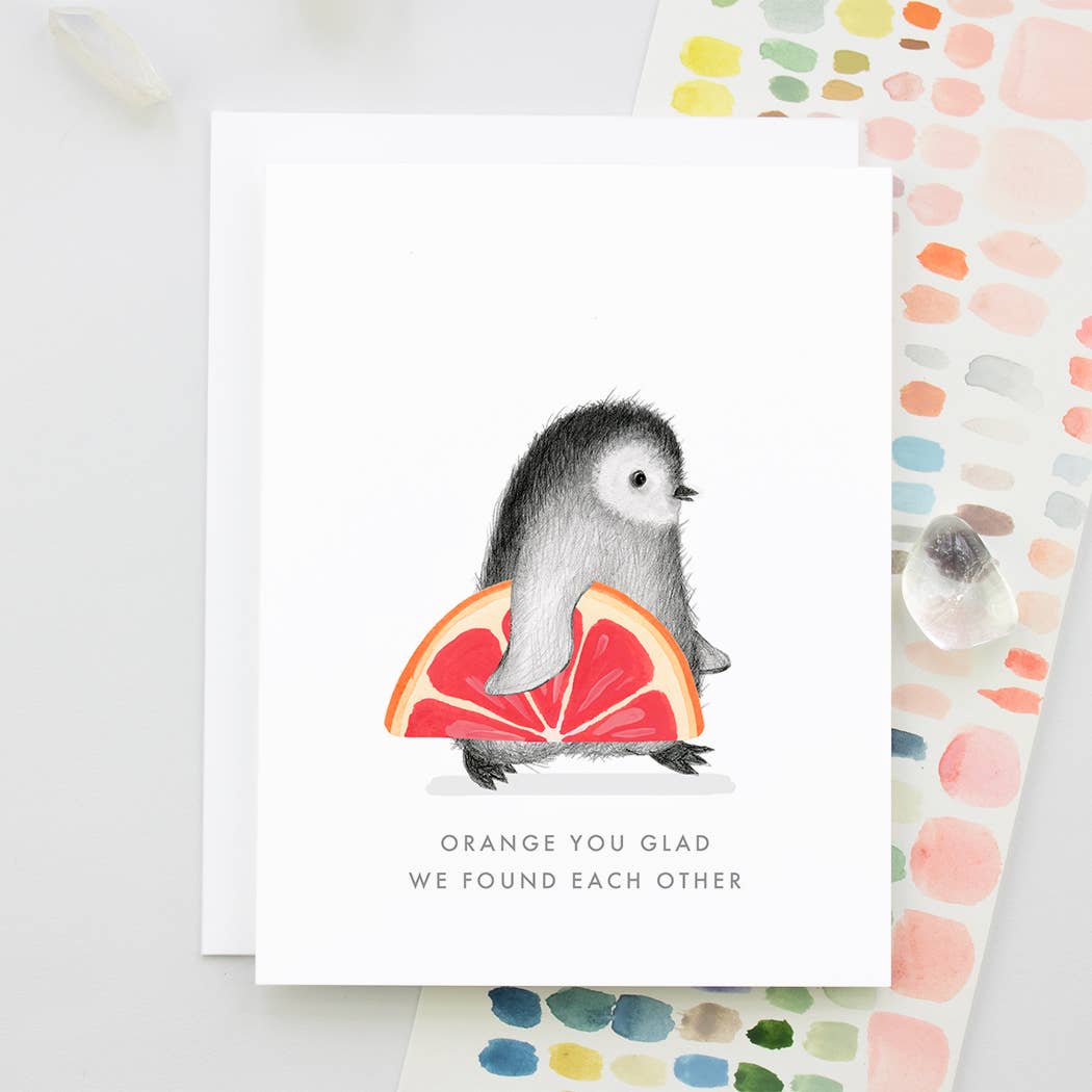 A hand drawn penguin with a painted orange slice text reads “Orange You glad We found Each Other”
