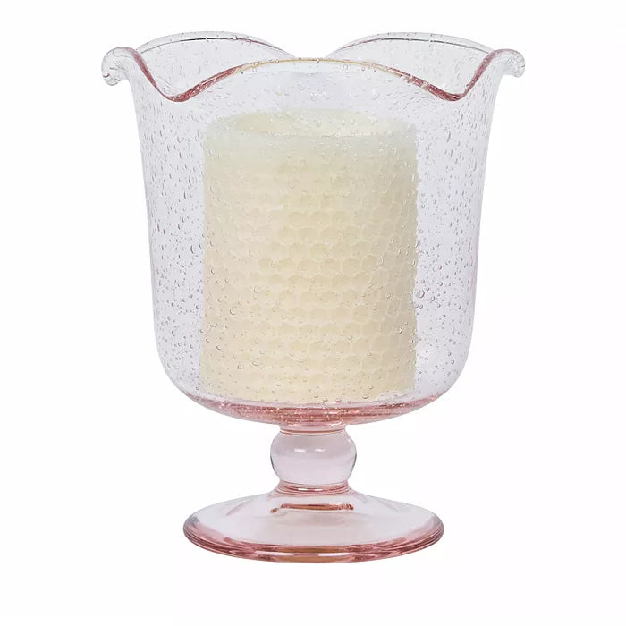 As a delightful centerpiece, in pairs on the mantel or in clusters—this eye-catching hurricane brings a splash of whimsy and a pop of color to any space. Inspired by the traditional bubbly glassware from Provence in southern France, this perpetually effervescent statement piece is handmade of sturdy mouth-blown glass with a beautiful pedestal base and a subtly ruffled rim. Gift boxed.