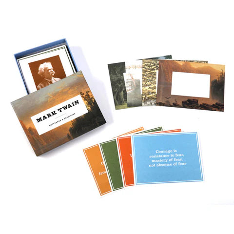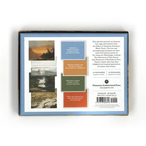 This spirited collection features four wry observations from the father of American literature, Mark Twain. The cards are paired with envelopes with four designs, featuring historical images of life along the Mississippi and evoking the magical worlds of The Adventures of Tom Sawyer and Adventures of Huckleberry Finn, Twain's classic tales that have delighted and inspired generations of readers and writers.