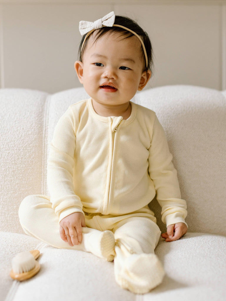 This Kit Ribbed Sleeper features a two-way zipper for easy changing. This organic favorite is now easier than ever to cozy up with.