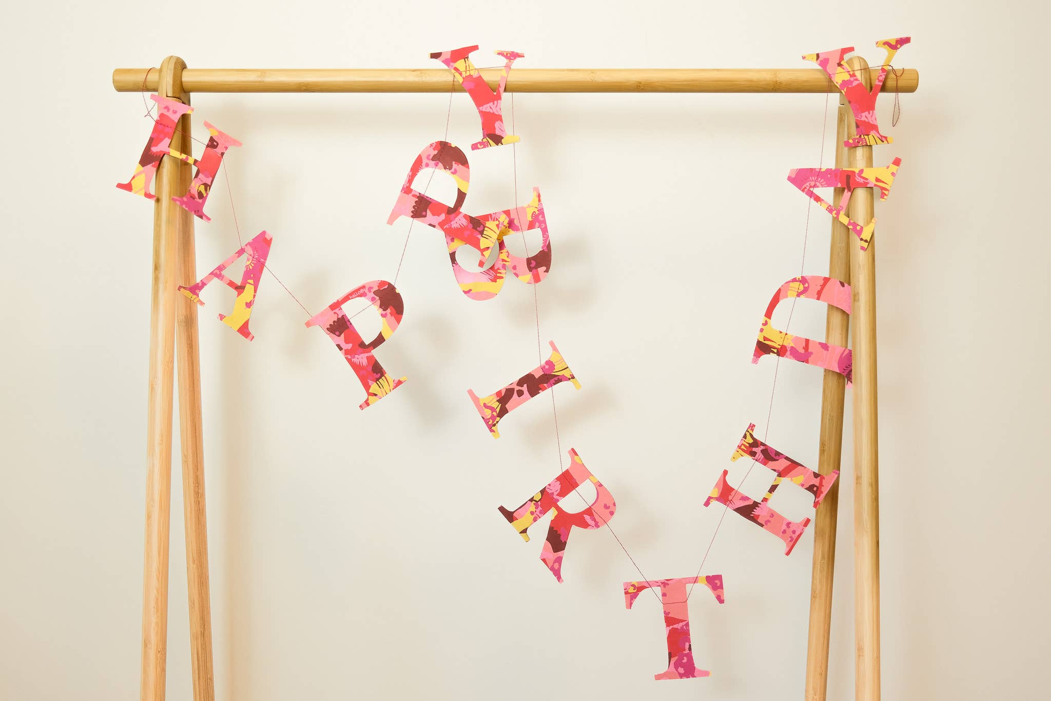 Made from recycled waste and test prints left over in the East End Press print studio, each of the thirteen letters that spell out Happy Birthday in this garland is completely unique, so colours and prints will vary.