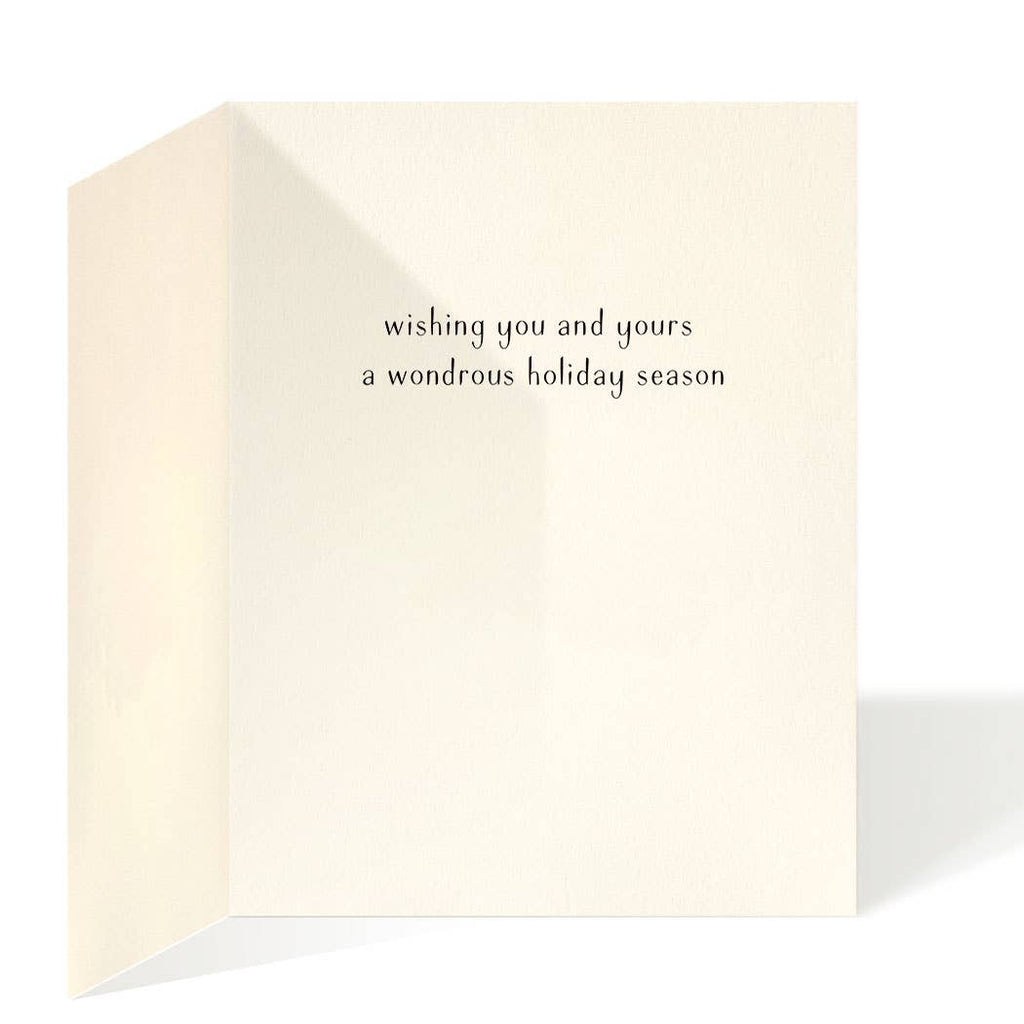 Wish a wondrous holiday with a white rabbit carrying a wreath among the snow-covered rocks in a evergreen pine forest. Perfect for Seasonal, Holiday, or Christmas greeting cards. Printed on a beautiful stock, our Occasion Cards feature Felix's watercolor drawings and his handwritten font. They're sure to add holiday cheer! The quality envelope is the finishing touch.