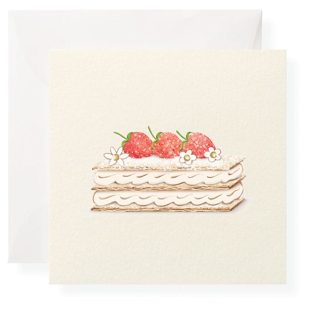 Our Strawberry Mille-Feuille Gift Enclosure is printed and hand-glittered in Memphis, TN. Hand crafted artwork, full color ink printed on natural white paper, hand-glittered, and paired with a vellum envelope.