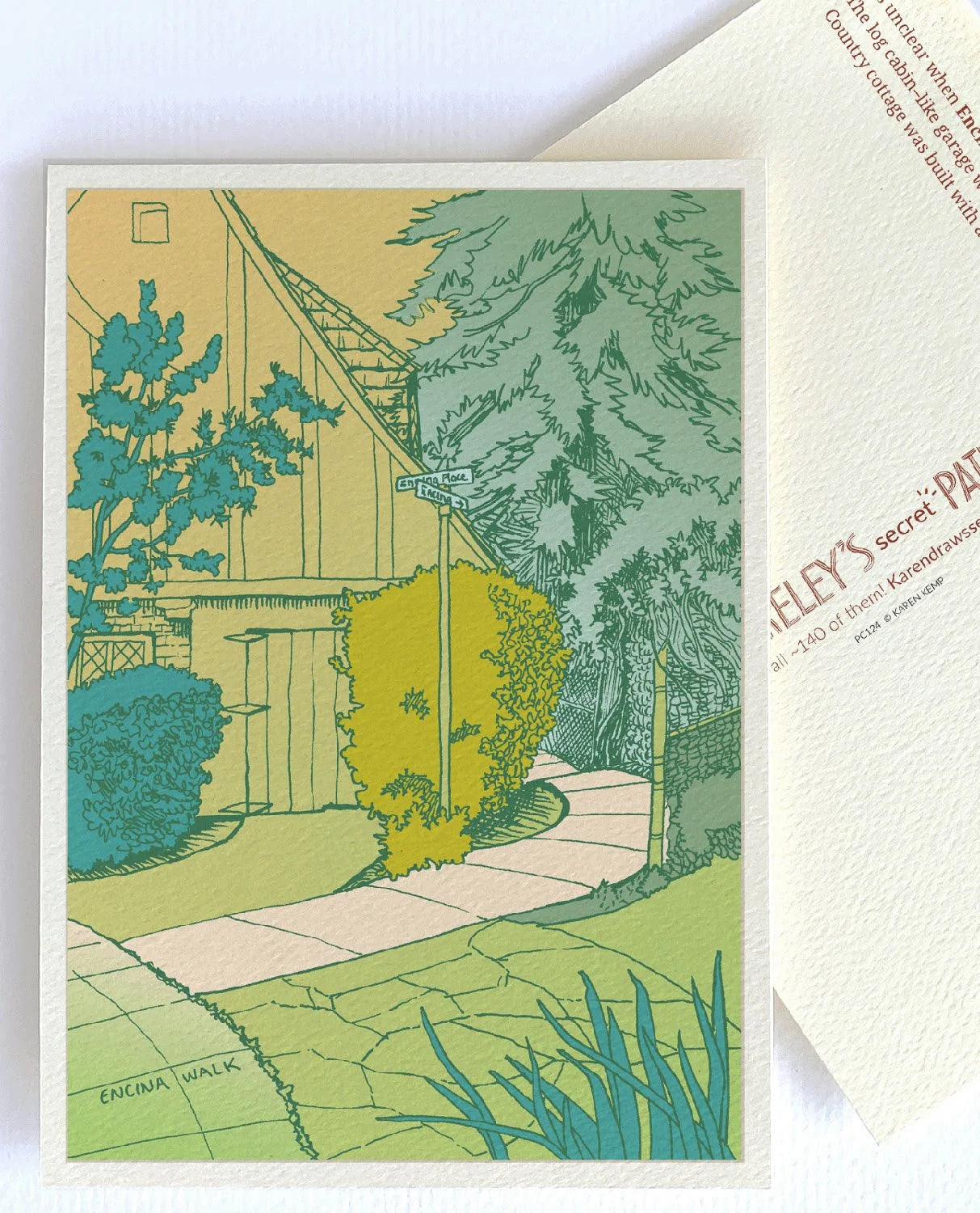 Mini-forest vibes, Berkeley edition. This charming line drawing of Encina Walk tucks you past a country cottage and into calm.