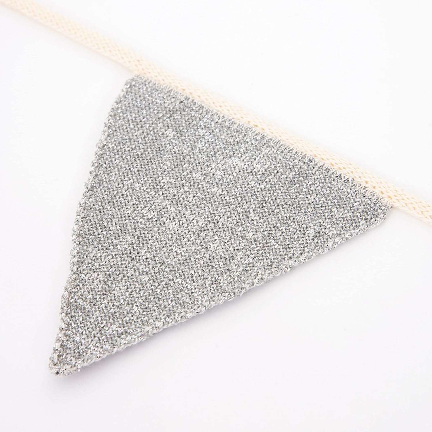 A beautiful garland with knitted triangle flags attached to an ivory colored yarn with flecks of silver.