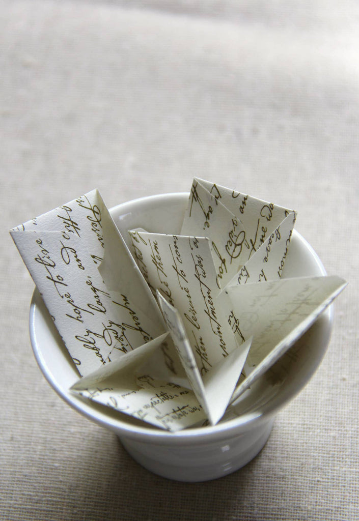 Set of 12 tiny envelopes, hand-assembled from script style letters printed on recycled natural cotton paper.