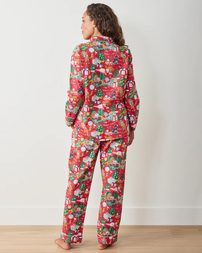 Deck the halls with feline festivities in our hand-drawn Meowy Christmas print. This Christmas long PJ set features holiday cats decking the halls across breathable organic cotton poplin. The button-down top offers a chic silhouette, while full-length pants include pockets for easy lounging. Delightful holiday cat pajamas for the friend whose pet has a Christmas stocking.