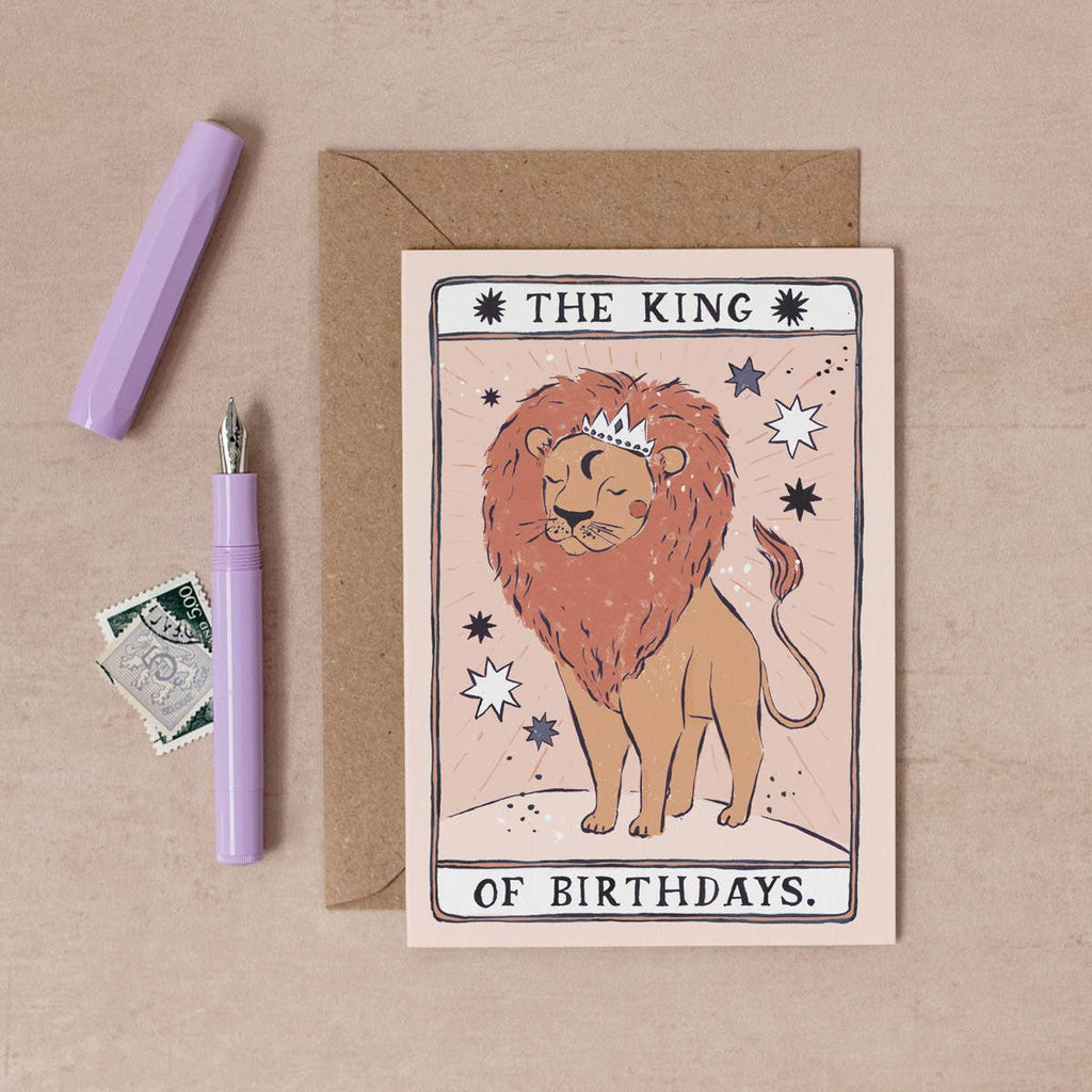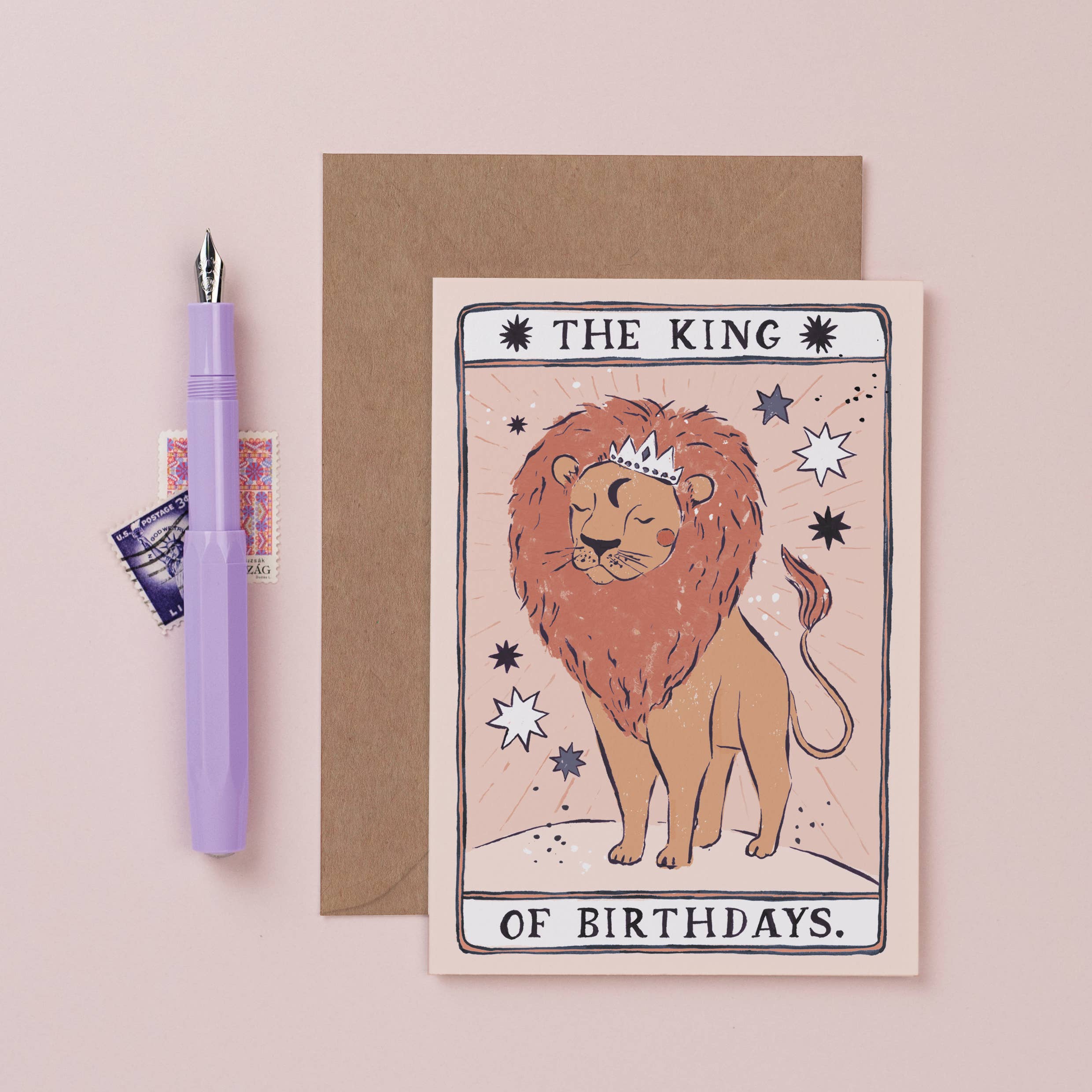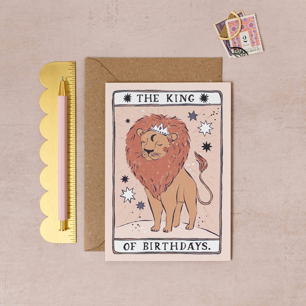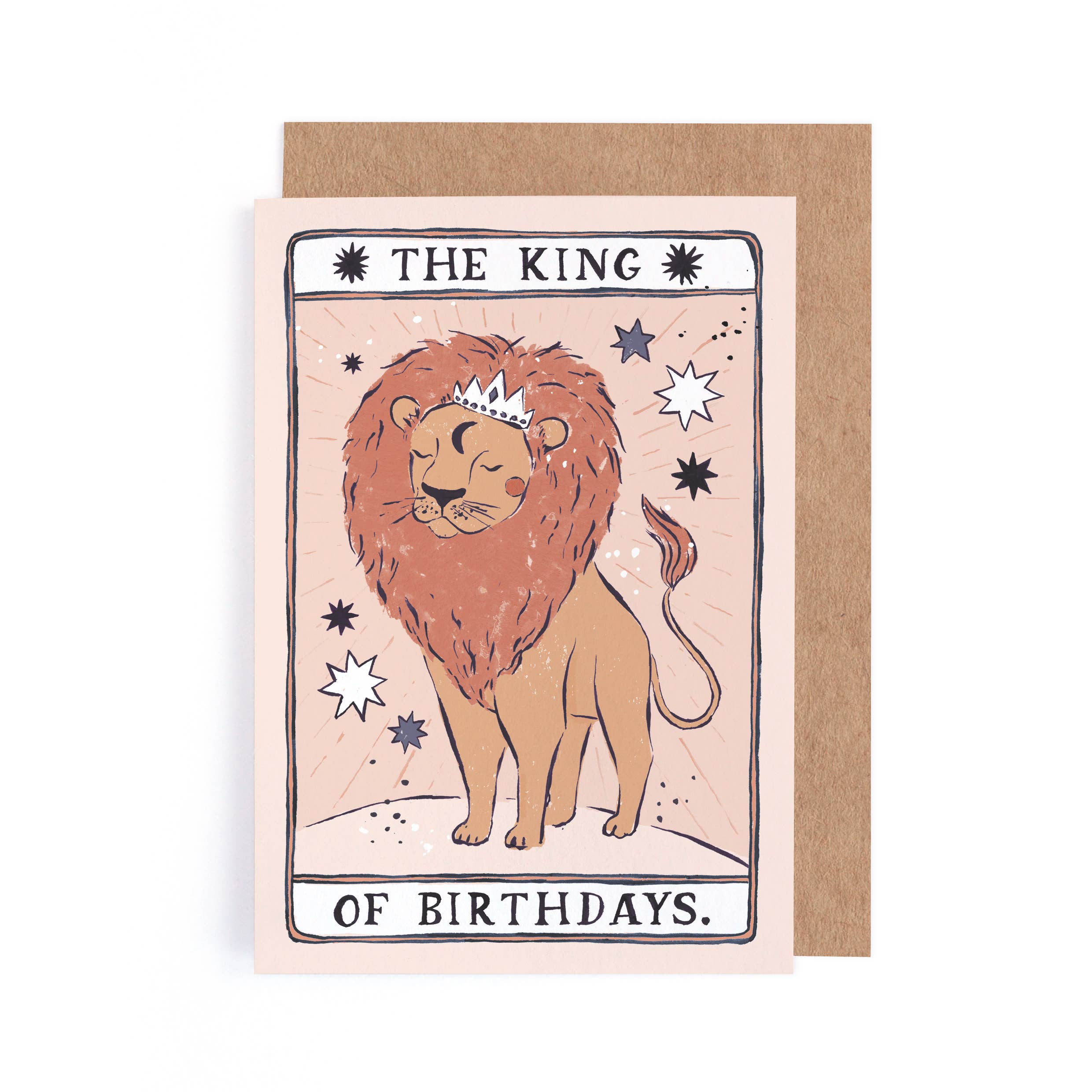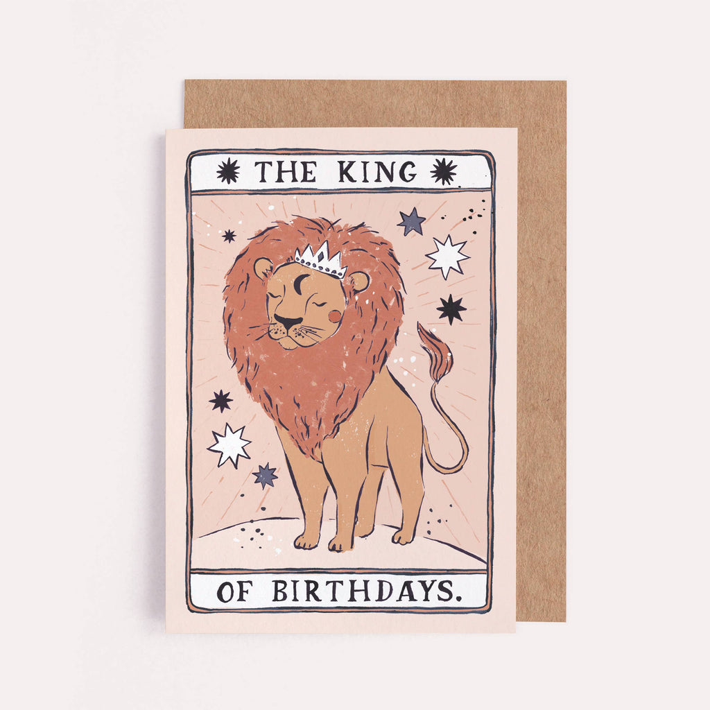 This 'King of Birthdays' greeting card is printed with hand painted tarot card inspired artwork of a proud lion wearing a crown surrounded by a sprinkle of stars.