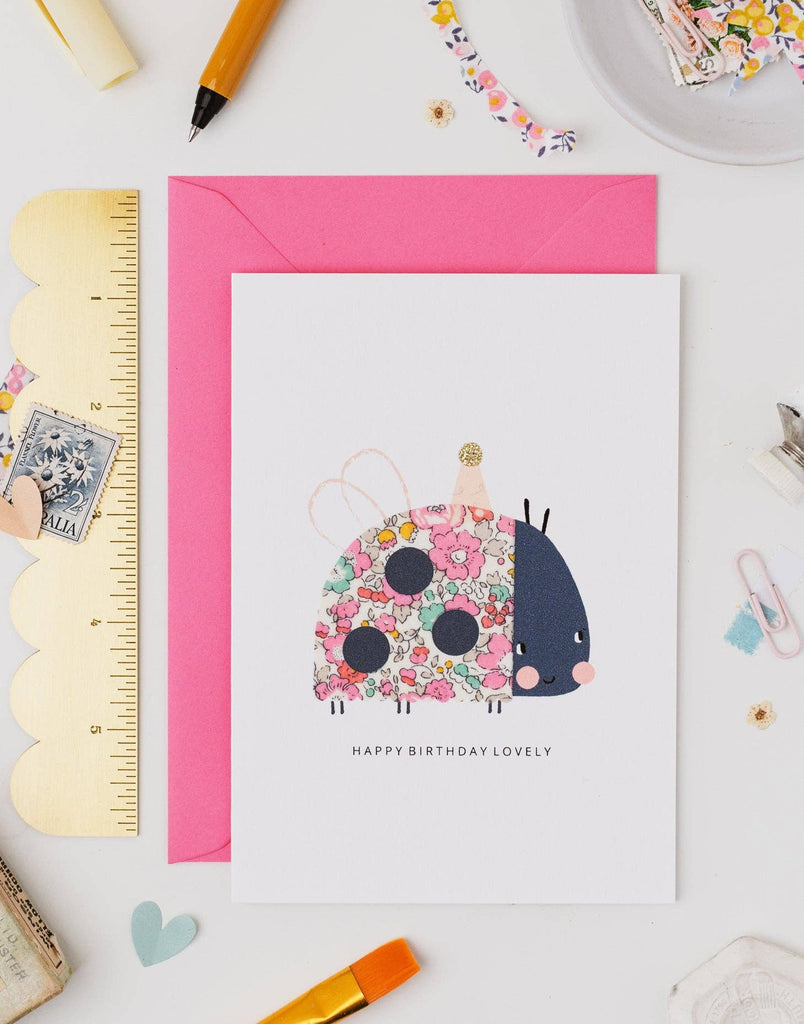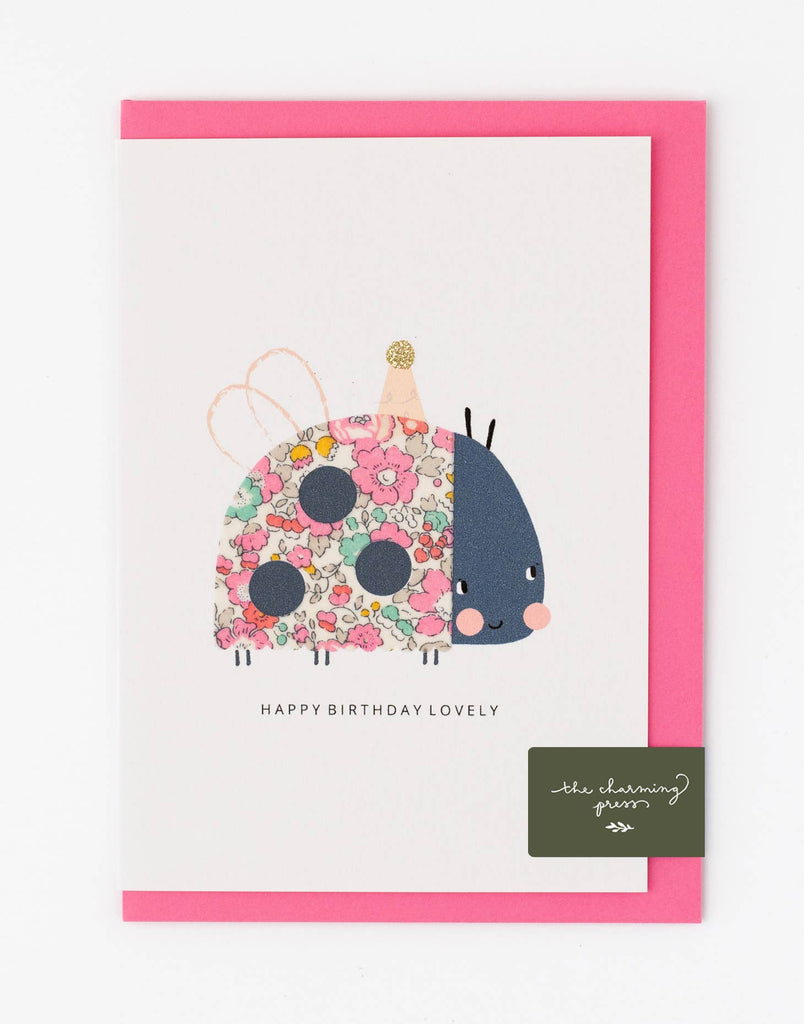 A lovely Liberty ladybird ready for the party in the Betsy Ann Pink print Hand finished with a golden biodegradable glitter bobble on her hat!